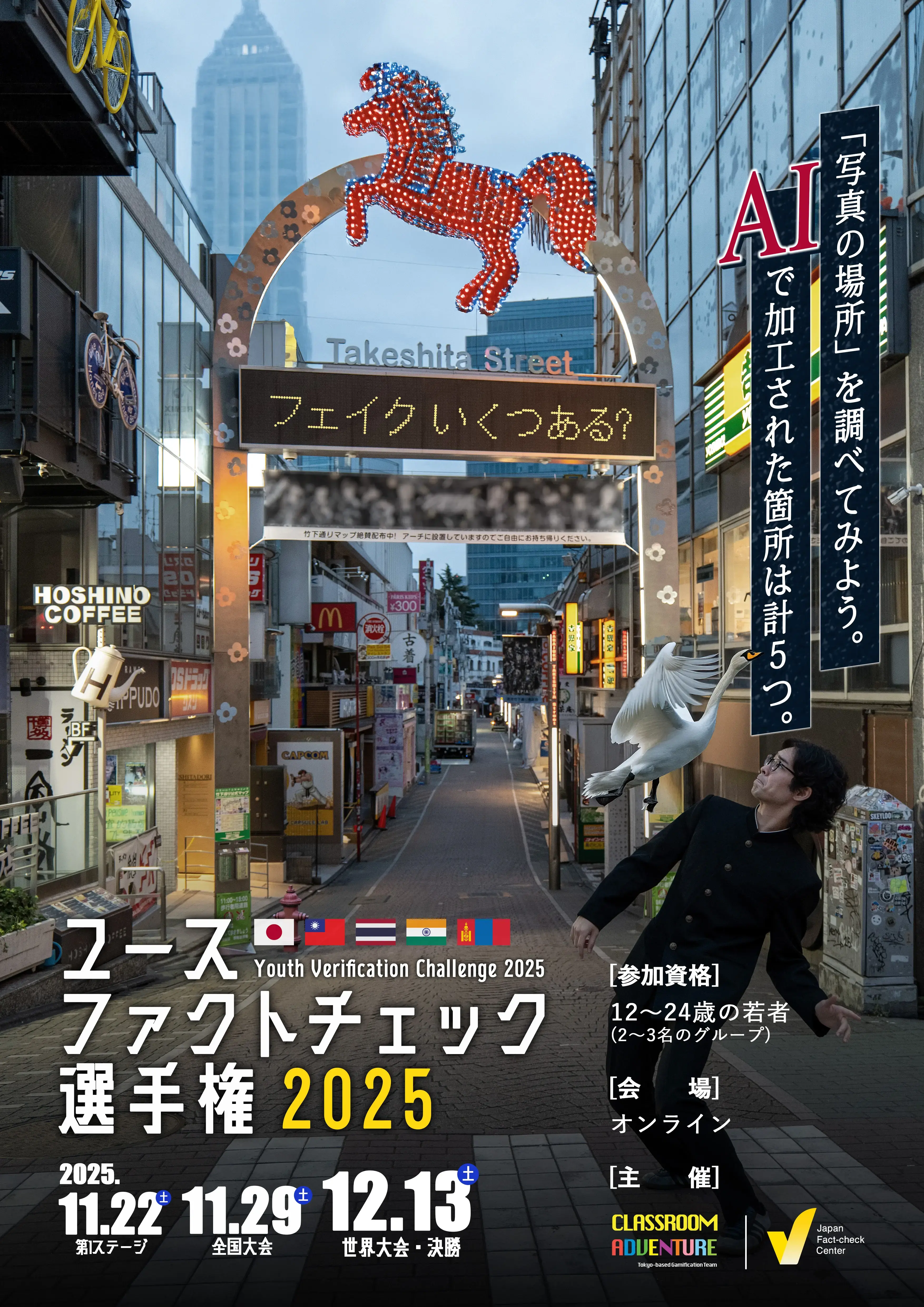 クラスルームアドベンチャーと日本ファクトチェックセンター(JFC)は11~12月、中学生〜大学生を対象に情報を検証するスキルを競う国際大会「Youth Verification Challenge 2024 (YVC、日本語名はユースファクトチェック選手権)」をオンライン開催します。2〜3人でチームを組み、国内大会を勝ち抜くと世界大会でアジア各国のチームと決勝を争います。